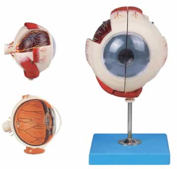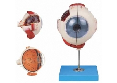 眼球放大模型将眼球纵切成两部分,左半侧的晶状体与玻璃体为固定形状,右半侧的巩膜可局部打开看到脉络膜,眼球内部显示睫状体、视网膜以及视网膜剖面(视网膜神经层构造)等结构,共有28个部位指示标志。